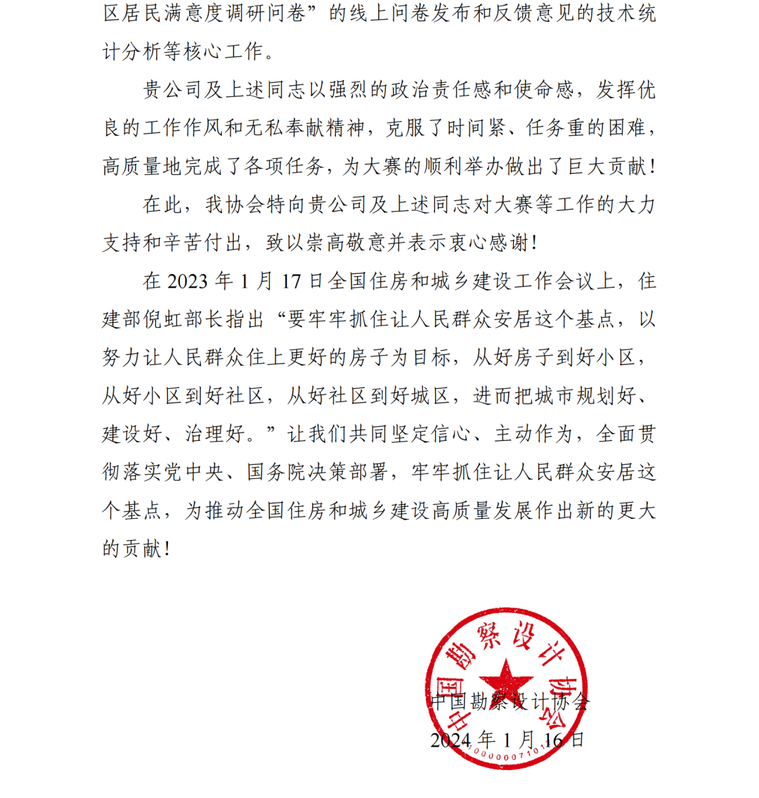 2024年1月16日,中建研科技所屬北京構力科技有限公司(以下簡稱“構力科技”)收到中國勘察設計協(xié)會發(fā)來的感謝信,對構力科技承擔的大賽系統(tǒng)平臺的搭建、運行維護及技術支持等工作表示感謝。