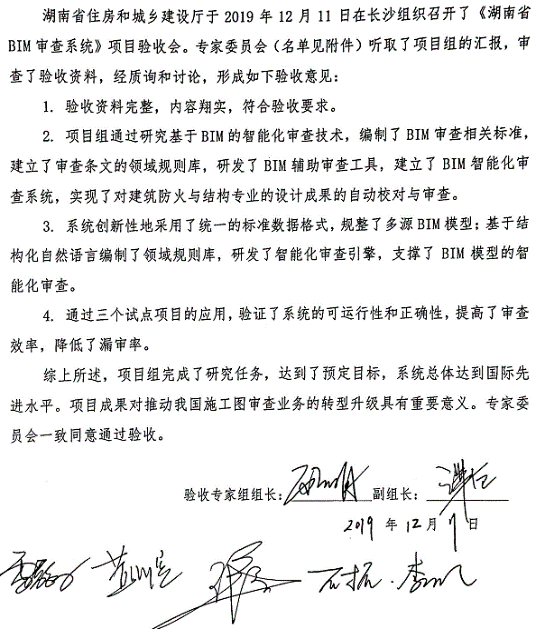 2019年12月系統(tǒng)通過(guò)了專家評(píng)審驗(yàn)收。由清華大學(xué)軟件學(xué)院副院長(zhǎng)顧明、全國(guó)勘察設(shè)計(jì)大師謝衛(wèi)等多名行業(yè)權(quán)威專家組成的驗(yàn)收專家委員會(huì)一致認(rèn)為,湖南省開(kāi)發(fā)完成的省級(jí)BIM審查系統(tǒng)“國(guó)內(nèi)首創(chuàng)、達(dá)到國(guó)際先進(jìn)水平”,具有較高的推廣應(yīng)用價(jià)值。