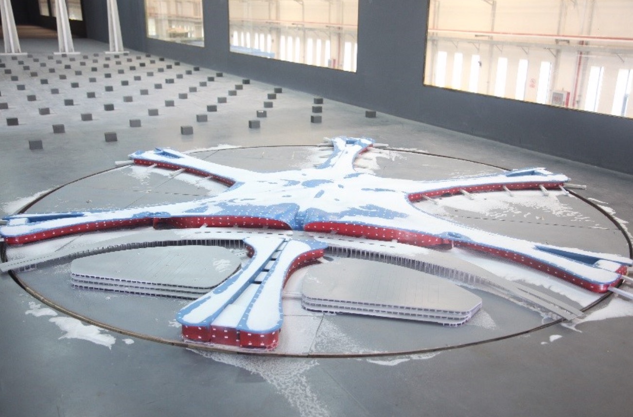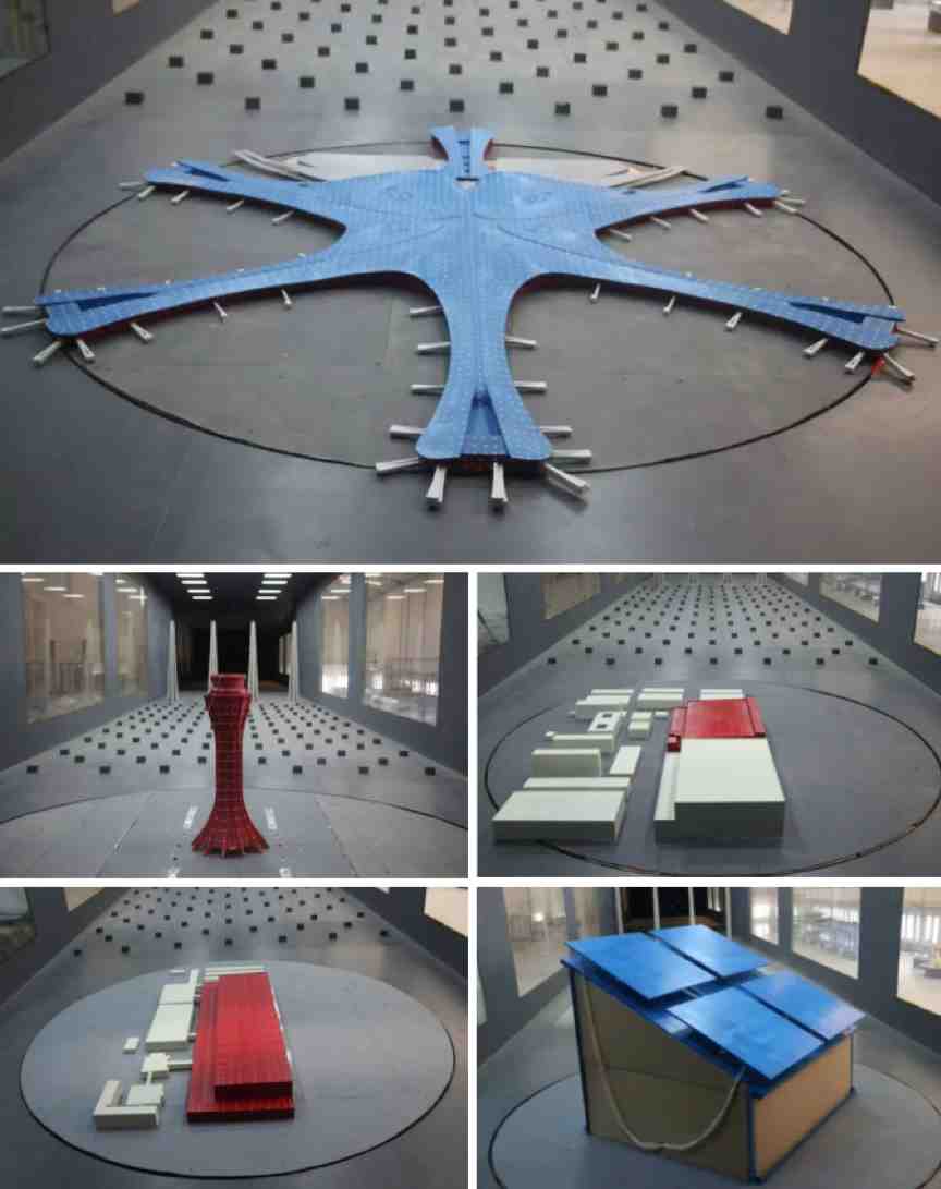 建研科技抗風(fēng)研究中心先后完成了北京大興國際機(jī)場航站樓、東塔臺、東航機(jī)庫、南航機(jī)庫等項(xiàng)目風(fēng)洞試驗(yàn)和風(fēng)振分析工作,為值機(jī)候機(jī)、空中交通指揮、飛機(jī)維護(hù)等各工種相關(guān)建筑結(jié)構(gòu)的抗風(fēng)設(shè)計(jì)提供荷載取值依據(jù)。