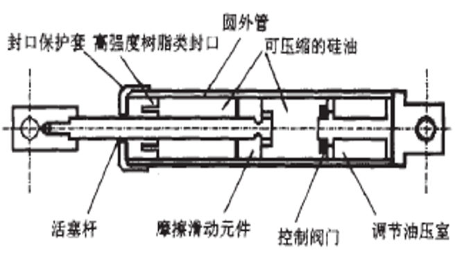 液缸式黏滯消能器的結(jié)構(gòu)構(gòu)造主要沿用機(jī)械液缸的結(jié)構(gòu),其外缸及活塞尺寸已經(jīng)形成系列化。根據(jù)構(gòu)造的不同可以分為單出桿流體消能器、雙出桿流體消能器和液壓缸間隙式流體消能器。液缸式消能器一般由缸體、導(dǎo)桿、活塞、阻尼孔和黏滯流體阻尼材料等部分組成(圖4)。活塞在缸體內(nèi)做往復(fù)運(yùn)動(dòng),缸體內(nèi)裝滿阻尼流體,活塞上有小孔成為阻尼孔。當(dāng)活塞與缸體壁發(fā)生相對(duì)運(yùn)動(dòng)時(shí),活塞的前后壓差使阻尼流體從阻尼孔中流過,產(chǎn)生阻尼力。